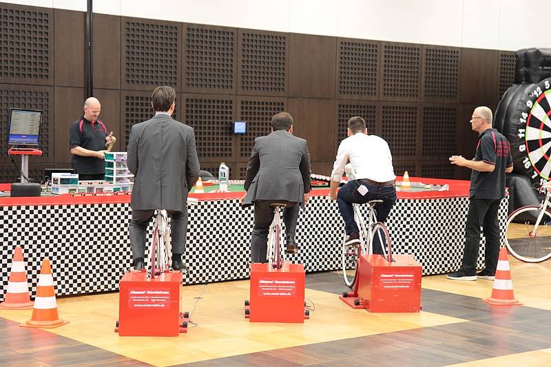 Am Gesundheitstag gab es also neben den üblichen Messungen (Blutzucker, Cholesterin, Körperfett und Blutdruck) eine Menge Bewegungsspiele und Aktivitäten. Denn wer den ganzen Tag am Schreibtisch sitzt, muss sich auch bewegen. Eine Carrerabahn, die von 4 Fahrrädern angetrieben wurde, war der Renner. Auch ein XXL Yenga, XXL Mikado, XXL Dart und ein Tischkicker für 8 Personen zog viele Teilnehmer an. Die BSG war mit einer Tischtennisplatte vor Ort.