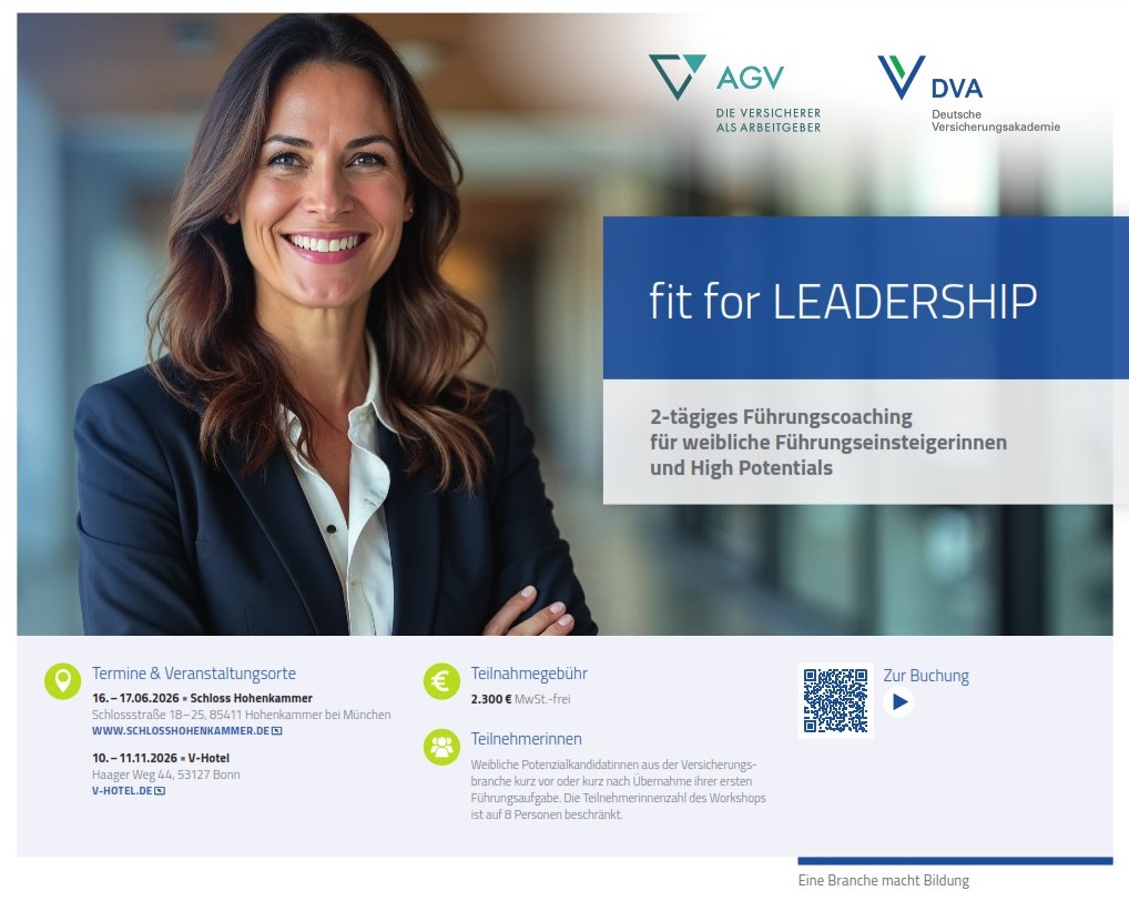 Der AGV-Branchenbeirat Women in Leadership & Culture hat daher das Projekt „fit for Leadership” ins Leben gerufen. Um Potenzialkandidatinnen bei der Übernahme ihrer ersten Führungsaufgabe optimal zu unterstützen, bietet der AGV ein gezieltes Führungs-Coaching an. Das Coaching wird in Kooperation mit der Deutschen Versicherungsakademie (DVA) sowie Bossert Associates, die jahrelange Erfahrung bei der Entwicklung von Führungskräften haben, durchgeführt. Ziel ist es, das eigene Selbstverständnis als Führungskraft zu schärfen und Strategien aufzuzeigen, um mit Situationen der Unsicherheit konstruktiv umgehen zu können.