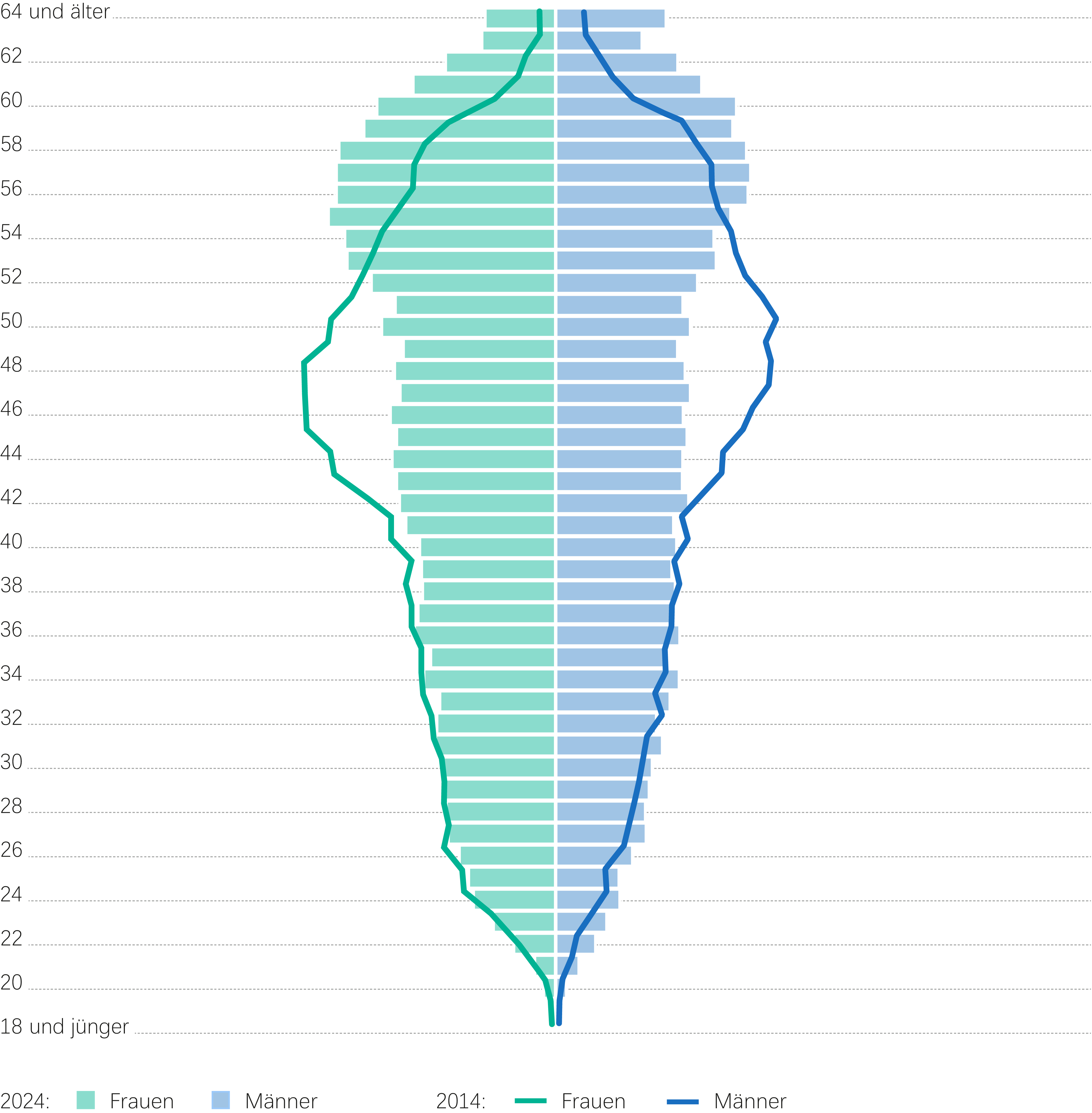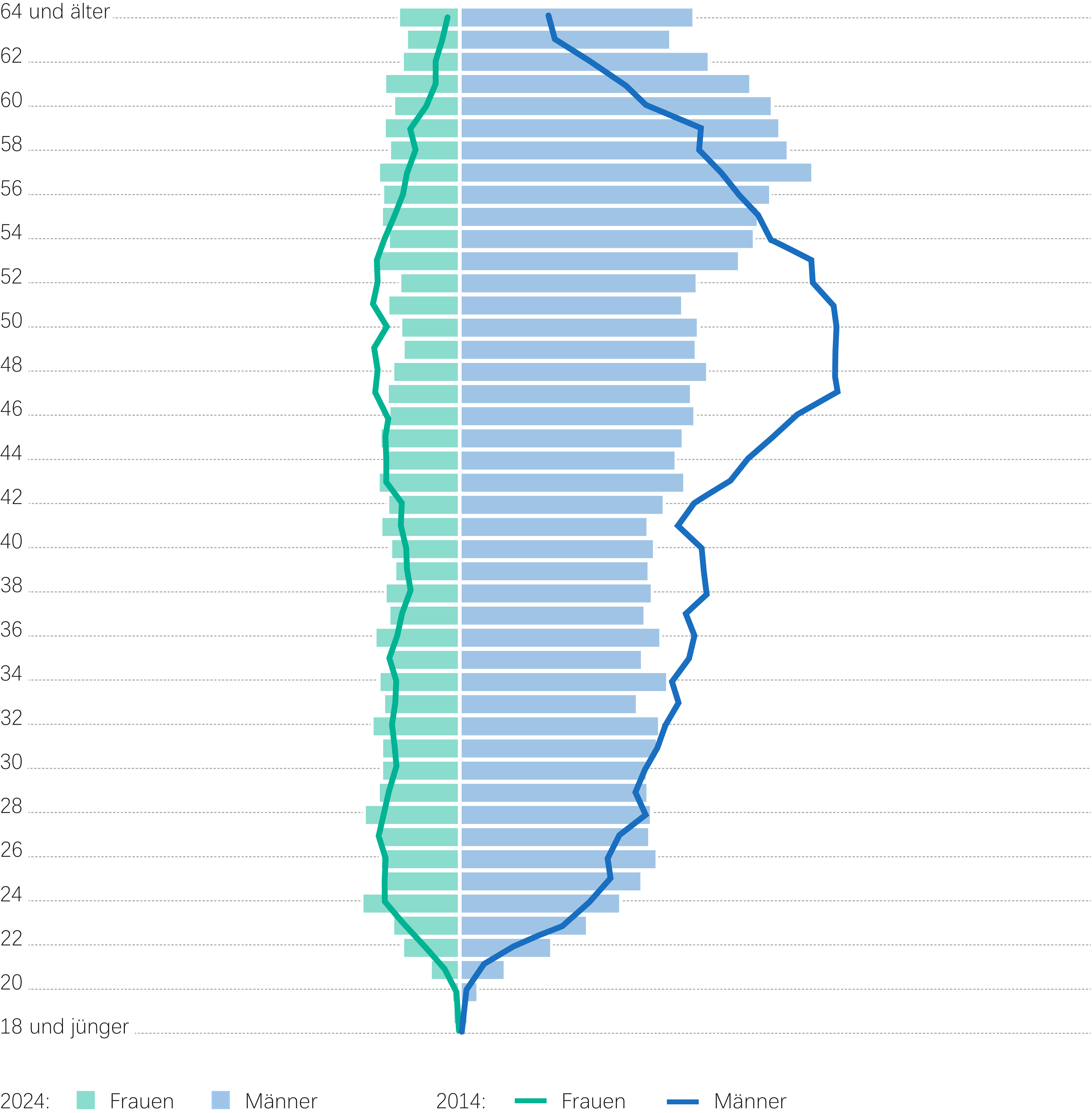 | Innen- und Außendienst (inkl. Auszubildende) | 44,1 | 43,8 | 44,0 | 43,4 | 41,8 | 42,6 |